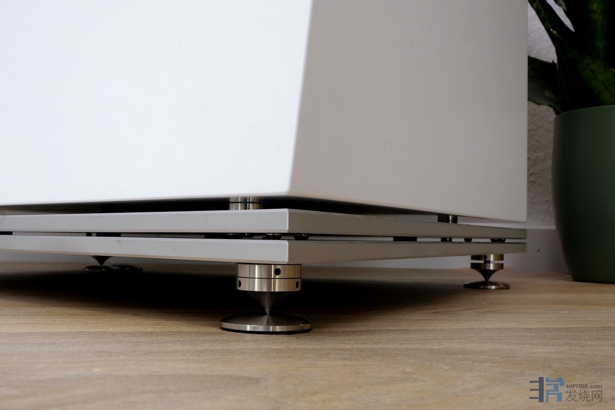 Trapeze Ri 通过单音箱线端子与功放连接,空中飞人没有选择双线分音。第三个连接端子很有意思:扬声器可以选择通过该端子接地,制造商称之为 “自由接地概念”。但这里实际接的是什么呢?肯定不是木质箱体......驱动单元的金属框体通过插座上的单独端子接地。此外,还有一个3级旋转开关,用于选择适应不同放大器(如晶体管或电子管放大器)的阻尼系数。您只需自行尝试其对声音的影响。众所周知,落地式扬声器离不开与地面的去耦。因此,Trapeze Reimagined 采用了由坚固双层铝板制成的底座。其中没有任何隐藏的部分,通过碳钢滚珠轴承去耦的设计清晰可见。在现有底座的最底部是带支撑板的经典 --- 高度可调 --- 脚钉。