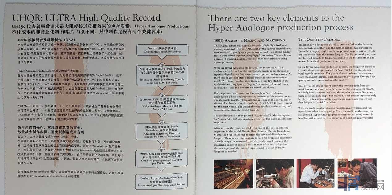 •        国际黑胶母盘大师印制:进入印盘阶段,由国际黑胶母盘大师 Bernie Grundman 亲自操刀。Bernie Grundman 在行业内声誉卓著,曾在德国、瑞典、日本、UCLA(加州大学洛杉矶分校)、AES(音频工程学会)和 NARAS(全国录音艺术与科学协会)举办过讲座、讲习班和研讨会。其丰富的经验和精湛的技艺,确保了印盘的高质量,精准呈现 UHQR 所追求的极致模拟之声。