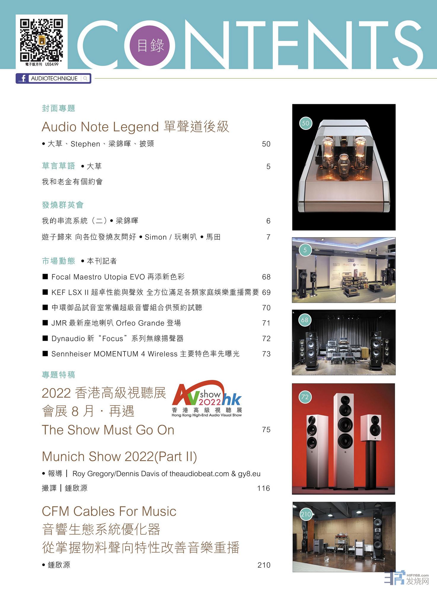 Tannoy Turnberry GR-OW 扬声器、Acoustical Systems Fideles Sublime动铁唱头、S.A. Lab Blackbird MKII胆合并机、Mark Levinson No.585.5 合并式扩音机、Spendor Classic 200Ti 扬声器 、Esoteric N-01XD 串流音乐播放器/ 译码器、Allnic H-5500黑胶唱头放大器 、Brise Audio Yatono-Lan 线、Shanling山灵 EA5桌面串流播放器 + JET1气动式喇叭、Shanling山灵 M7安卓无损音乐播放器及MG600木制半开放式动圈耳机、FiR Audio Frontier Series入耳式耳机、Campfire Audio Supermoon平板单元入耳式耳机,Increcable MVD-iEARTH地盒....,详细内容请参阅目录。