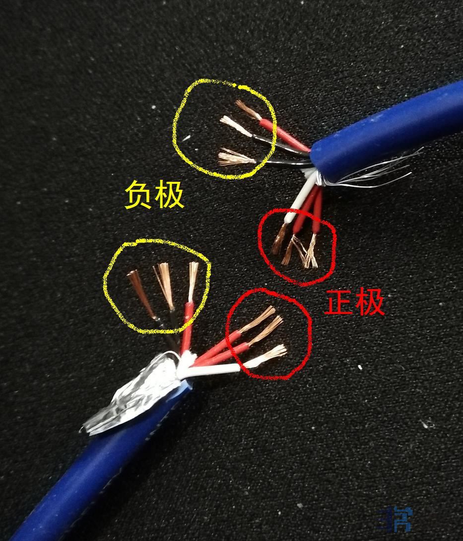 白色的和相邻的两根红色作为正极,两根黑色的和相邻红色的作为负极