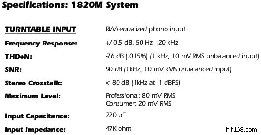而这1820m也有意思,它是自带符合RIAA标准的LP放大器的,品质怎么样就不知道了,以下是其技术数据: