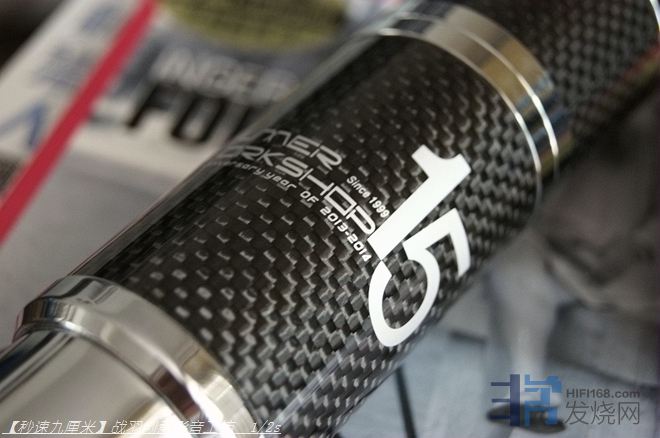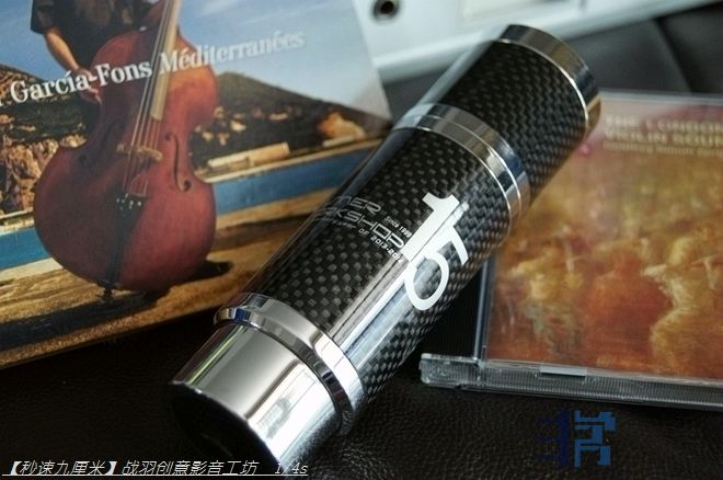 初见联盟“双核手雷皇”即知绝非俗物,虽说纸盒外包极为简洁质朴,打开却是光芒一片,那由黑色油亮的碳纤表层;精密CNC厚铝壳体和镀铑白金插头组合而成的电源净化器,精密细致简直堪称艺术品,即便握在手里也是一种享受。“双核手雷皇”呈圆柱状,长140mm,直径39mm,重280g,主体以CNC精加工厚铝制成,表面高亮抛光处理,周身环覆一层黑色高档碳纤,细密透亮,仿似包浆的文玩,手感细腻柔润,碳纤除了质轻耐腐极具装饰性外,还对隔绝电波干扰具有一定作用,而在其上一行银色丝印傲然镌刻,正是“Wilmer Workshop 15周年”的字样,搭配上尽显清丽脱俗,华美质感扑面而来。“双核手雷皇”的两端设计也各有讲究,一头即由美标镀铑白金插头构成,另外一端正中预设一枚4mm插孔,可以驳接各类地盒以发挥最大效用。值得一提的是,其美标插头外设一枚可拆卸铝质旋套,在拔下不用时可套起并旋紧,以便保护插头,而与壳体表面印字相呼应,旋套外露端面上也有一行“Wilmer Workshop 15周年”字样,采用激光蚀刻而成,由此也将“双核手雷皇”的精制工艺推向了极致。