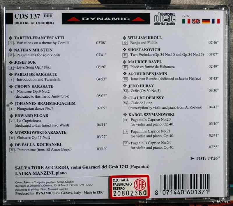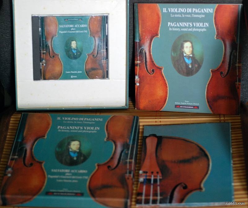 这张CD是意大利一家叫DYNAMIC唱片公司制作的限量版,主要是详细介绍帕格尼尼的1742年瓜纳里小提琴的历史、图纸、详细图片(包括琴身里面的各种签名),有一本书、一张大海报,CD的内容也非常丰富,找了阿卡多录了一组小品,74分钟精彩的内容,曲目也很喜欢,尤其录音也非常出色,应该是意大利最棒小提琴录音了,定位、空间感都很好,小提琴音色柔美,我还以为帕格尼尼的小提琴音色是很尖锐透亮的,可是我错了,很少能听到如此柔美细腻的小提琴音色,能听出厚度的小提琴相当少有,强烈推荐大家找找这张CD,听说也有普通版的发行(没有书和海报),发行日期是1995年。