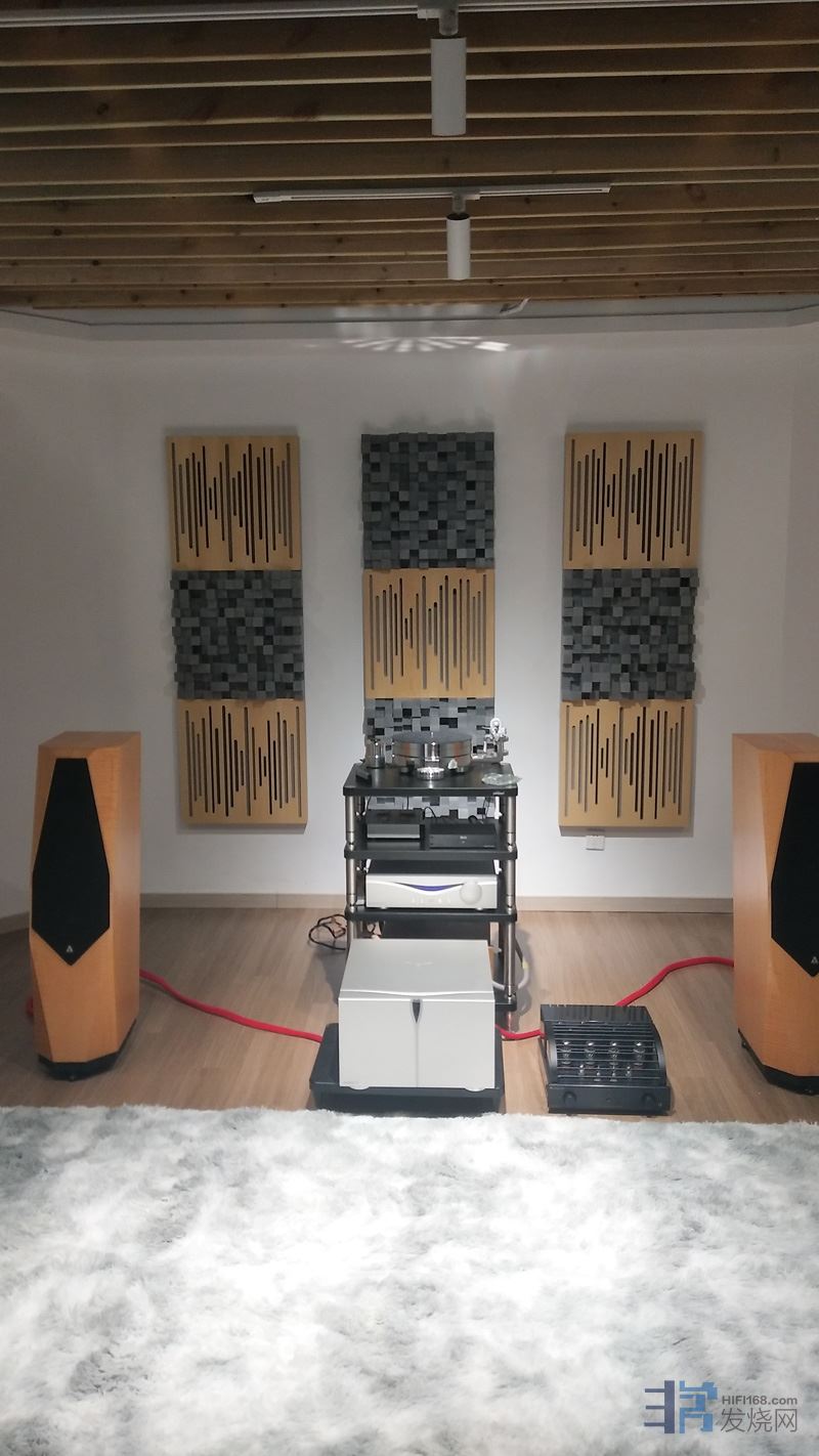 听音室内所使用的声学模块为威巨声Vicoustic的Wavewood扩散板、Flexi Wood A50吸音板、Multifuser DC2扩散板。一边放音乐一边安装,基本上每装上一块都能感受到声音的正面变化,混响越来越少,声音越来越凝聚,层次感与解析力越来越好。真是不用不知道,一用吓一跳!!!全部装完后,不仅美观,有这很好的既视感。声音表现也是非常满意。物有所值。