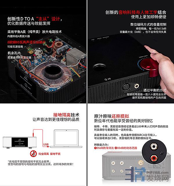 虽然定位在「入门」,Q-15 的设计却不敢一丝含糊,例如:同样导入USB介面隔离技术与USB介面384khz/32bit接收能力、数位音频函数补点技术、数位滤波IRI与FIR混合设计技术、数位与类比电源分离设计、星形接地线路板裂作、耳机平衡输出与非平衡输出以及考究适当的零件取用、如Polymar鉭质电容、白金接点切换开关、四层PCB并且铜膜加厚处理....