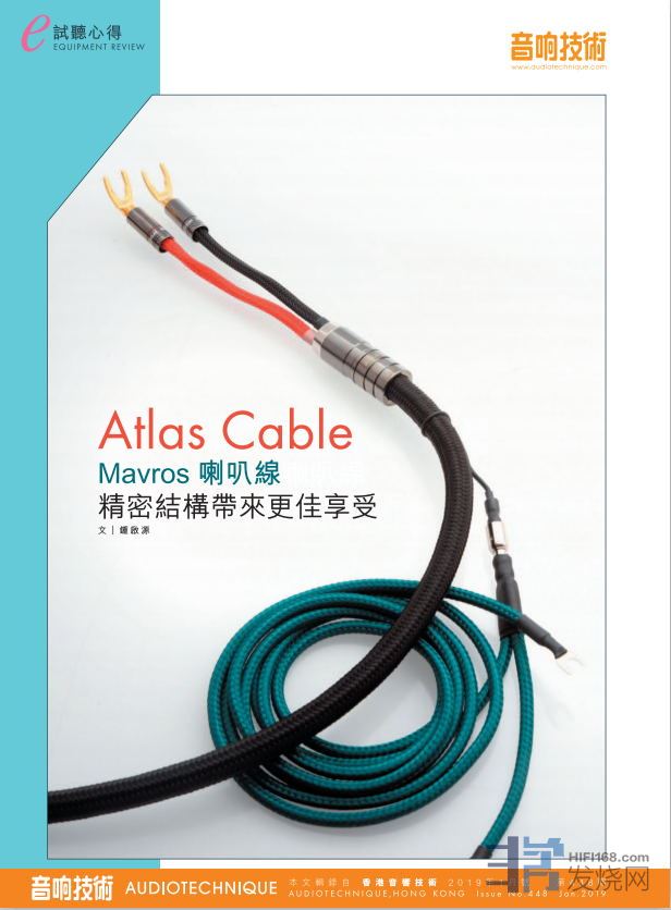 这次测试的Atlas Cable Mavros喇叭线属最基本之2-2款式,不过除了这里所见的传统单线接驳款式外,还另有2-4和4-4的Bi-wiring结构编排,也就是Mavros喇叭线的接插分别作出由二变四或由四去四的处理,两组额外增加的接线端所用导体为单枝纯铜,主要用于中高频传送,因此发烧友若希望从单线转至双线接驳的话,可以考虑改用Mavros的Bi-wiring线。