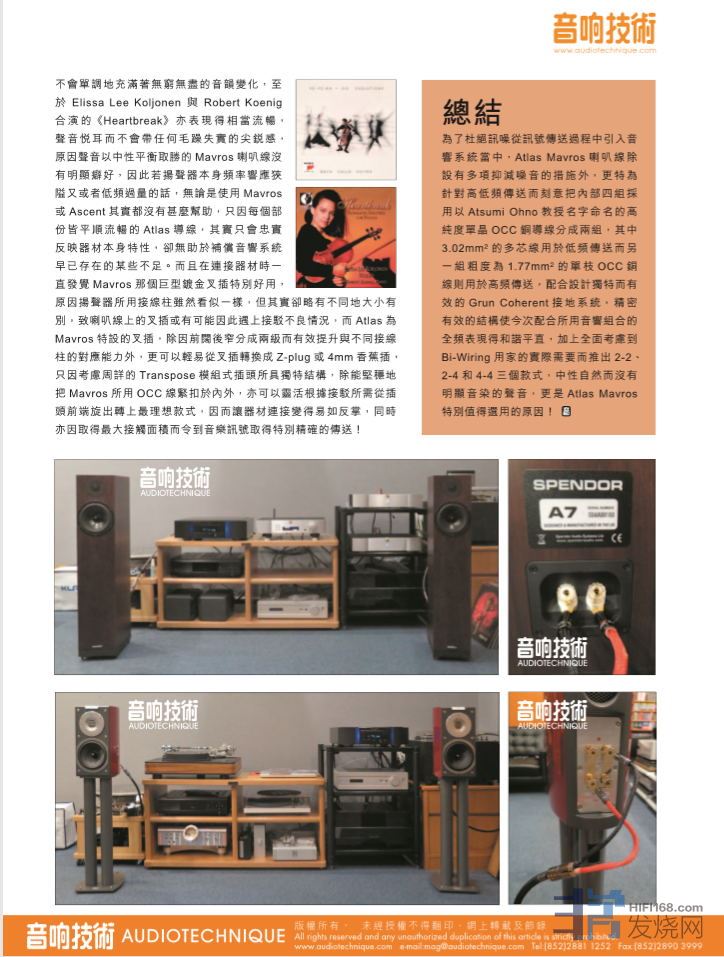 至于Elissa Lee Koljonen与Robert Koenig合演的《Heartbreak》亦表现得相当流畅,声音悦耳而不会带任何毛躁失实的尖锐感。原因声音以中性平衡取胜的Mavros喇叭线没有明显癖好,因此若扬声器本身频率响应狭隘又或者低频过量的话,无论是使用Mavros或Ascent其寅都没有什么帮助,只因每个部份皆平顺流畅的Atlas导线,其实只会忠实反映器材本身特性,却无助于补偿音响系统早已存在的某些不足。而且在连接器材时一直发觉Mavros那个巨型镀金叉插特别好用,原因扬声器所用接线柱虽然看似一样,但其实却略有不同地大小有别,致喇叭线上的叉插或有可能因此遇上接驳不良情况,而Atlas为 Mavros特设的叉播,除因前阔后窄分成两级而有效提升与不同接线柱的对应能力外,更可以轻易从叉插转换成Z-plug或4mm香蕉插,只因考虑周详的Transpose模块式插头所具独特结构,除能坚稳地把Mavros所用0CC线紧扣于内外,亦可以灵活根据接驳所需从插头前端旋出转上最理想款式,因而让器材连接变得易如反掌,同时亦因取得最大接触面稹而令到音乐讯号取得特别精确的传送!