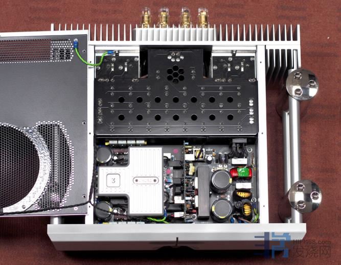 TO3功率晶体被横向锁在一块块垂直叠放的铝合金小板子上,再固定在背板内侧,每边共有8个功率晶体,每声道合计共使用16颗独家TO3功率晶体。