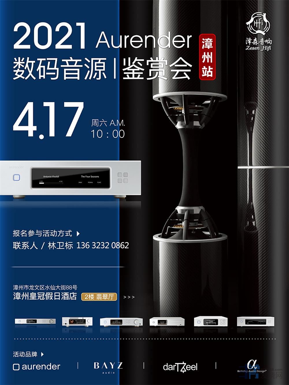 2021.4.17 周六 AM10:00 Aurender 数码音源 鉴赏会 漳州站,我们在漳州皇冠假日酒店2楼 翡翠厅与您相约!