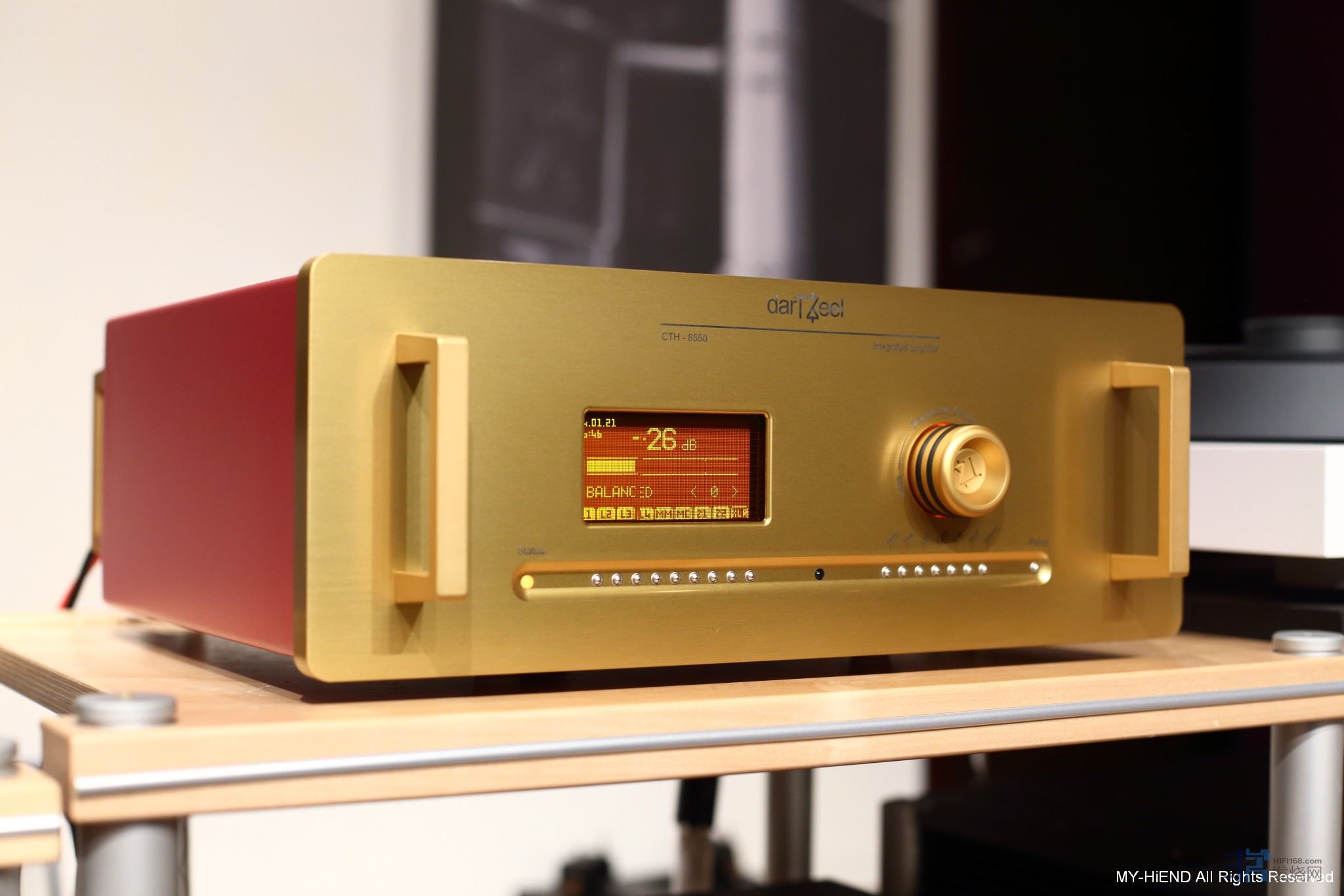 这次搭配 Vivid Audio G3的放大器是瑞士darTZeel 顶级综合放大器 CTH-8550,这是厂方号称毫不妥协的综合放大器,全瑞士设计制造,外观做工无可挑剔,从小巧精致的按钮和极具手感与视觉享受的音量旋钮就可看出细节,金属面板与把手的表面处理极具质感,后侧输入与输出端子排列美观一致,身为一部顶级高价的器材就是得有够水平的外型。