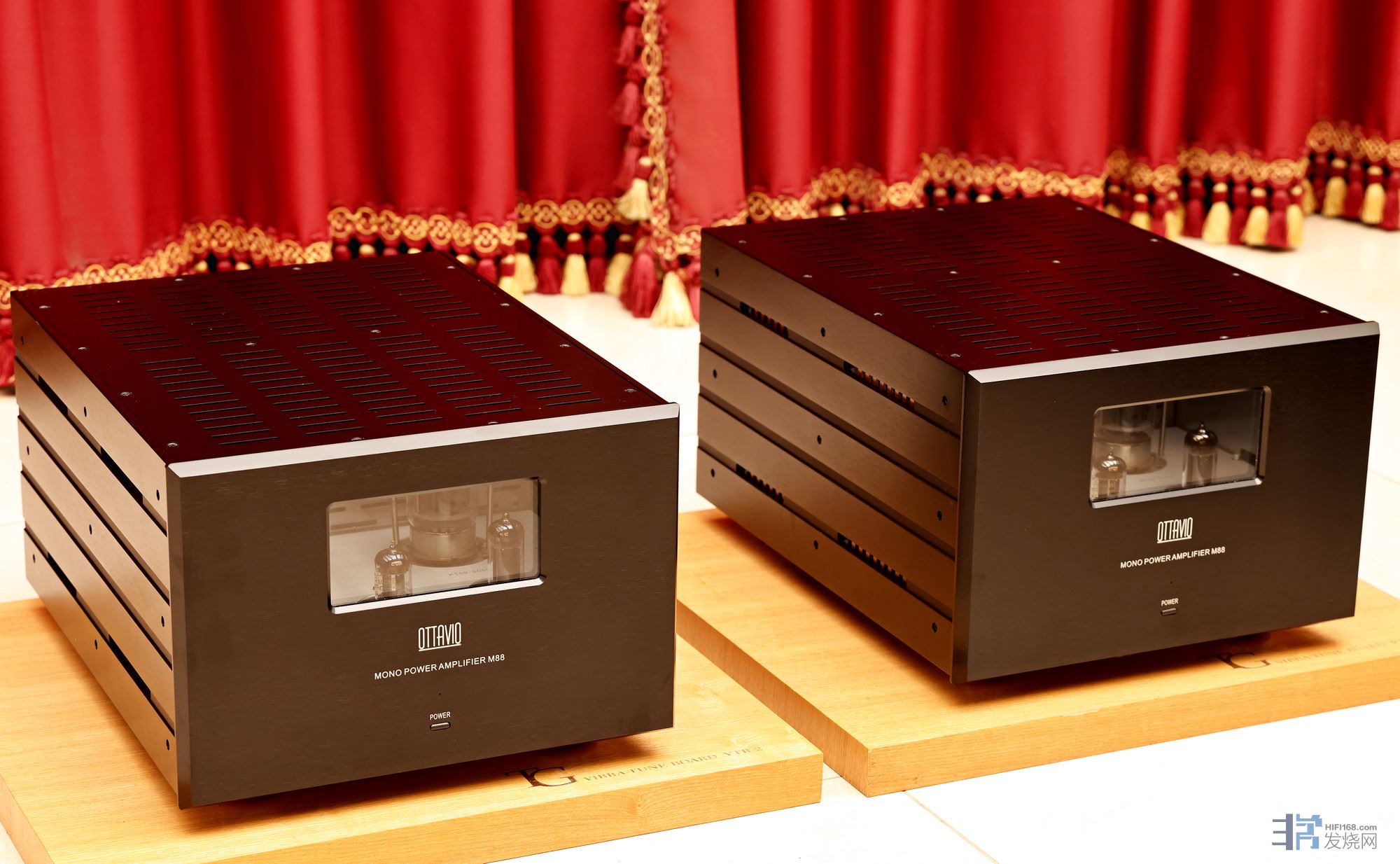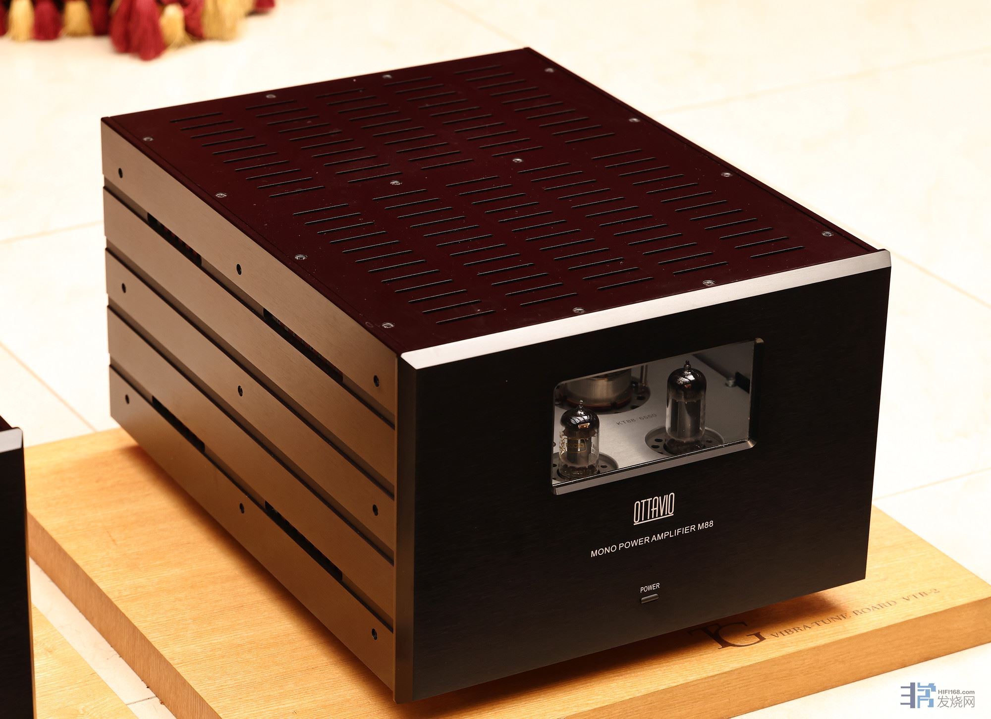 丽确M88单声道后级提供单边70瓦的强大输出功率,使用两支KT88、1支12AX7、2支12AU7,售价是4.8万元一台,9.6万一对。