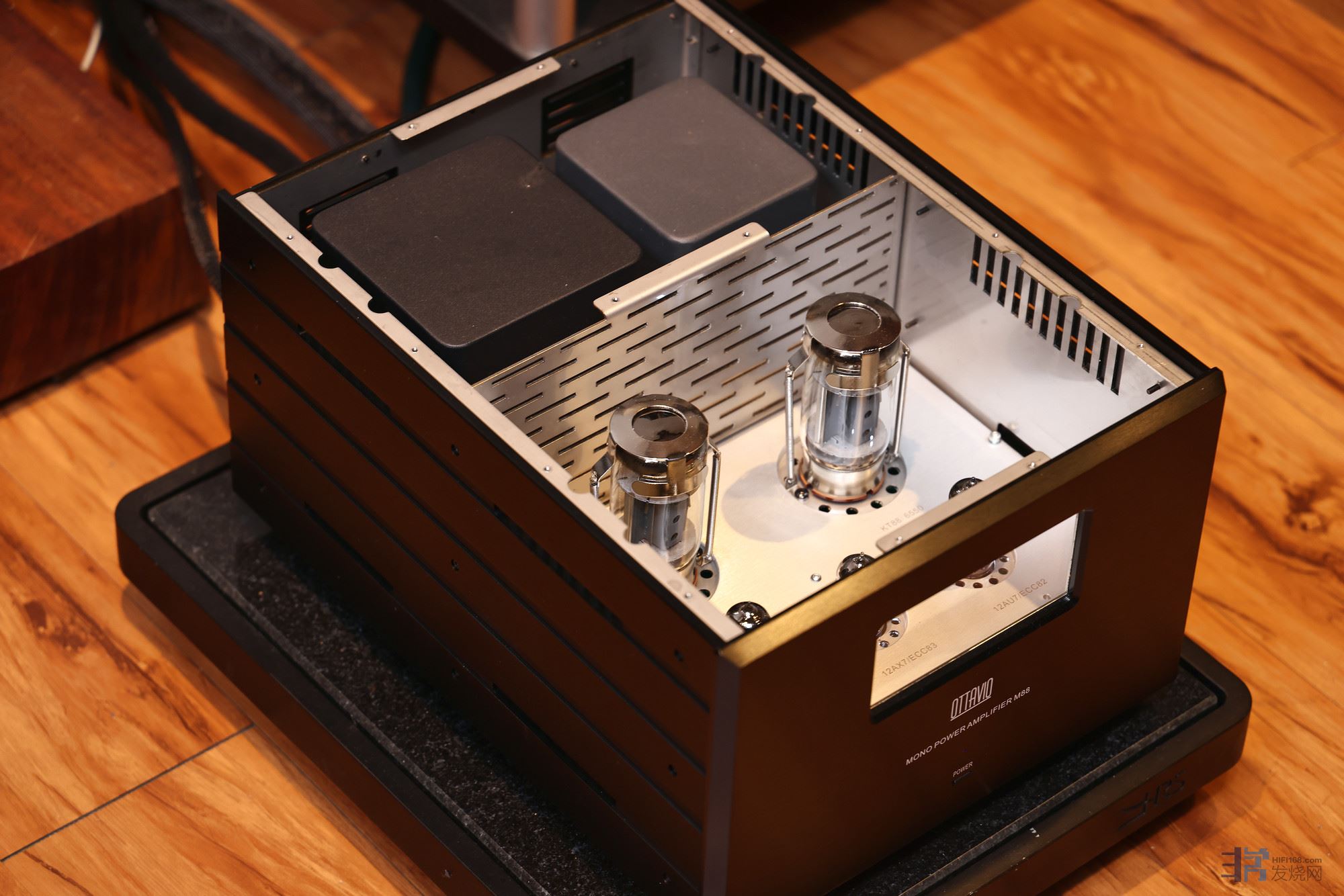 M88是KT88推挽单声道电子管后级,第一级使用12AX7进行电压放大,第二级使用2支12A∪7当推动,功率管采用KT88(6550)。