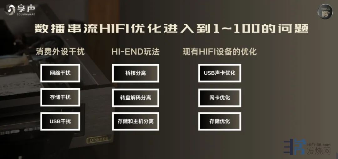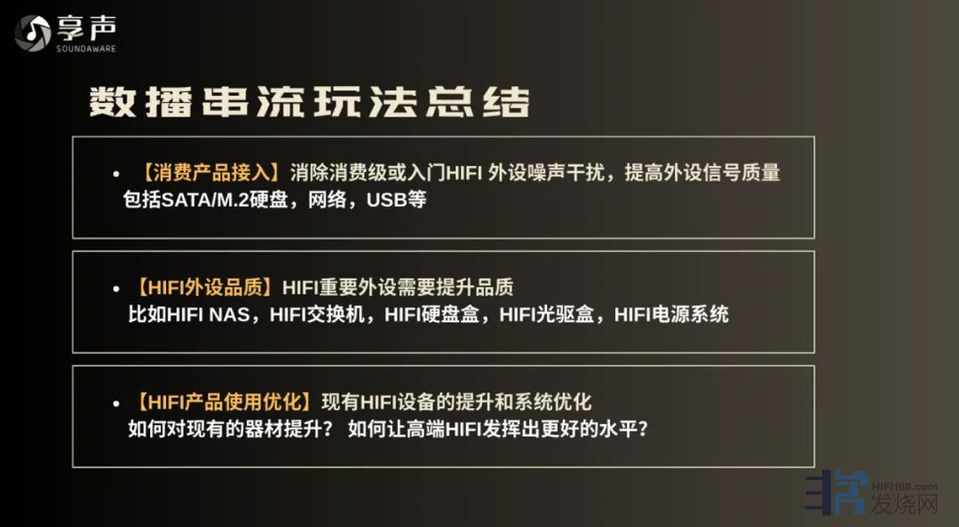 作为全球最早一批从事专业串流数播解决方案研发的企业,享声2011年就正式踏入了该领域,至今共发布了几十款数播类产品。15年以来,享声发现数播早已不是0和1的问题,而是从1到100的问题。这次享声的解决方案,针对现在的串流数播所存在问题进行全方位、综合优化,对于HI-END级的音源仍然适用。