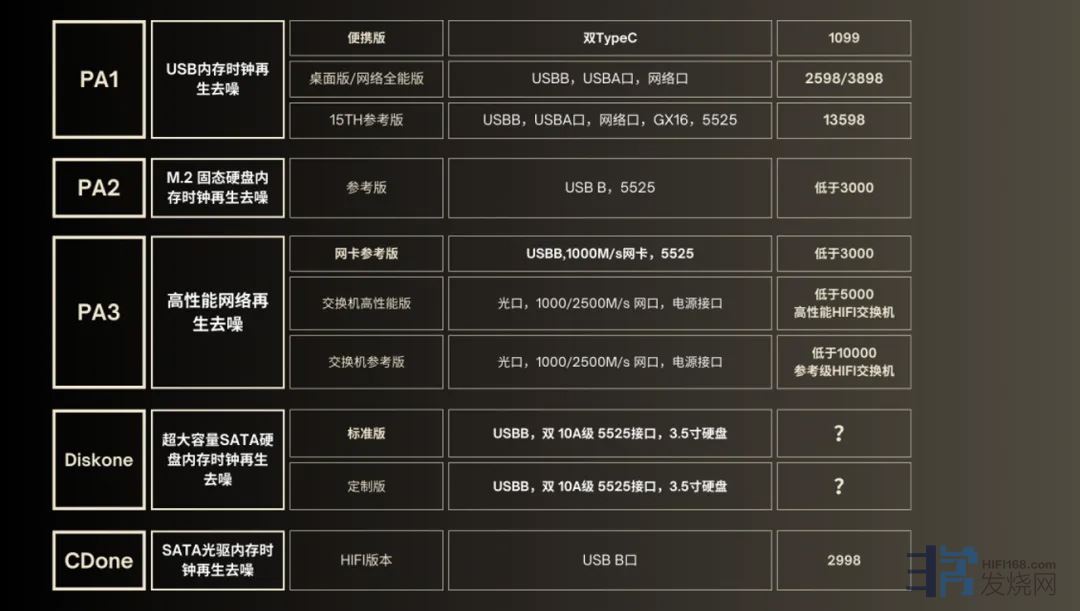 必须要进行去噪和时钟再生,防止消费产品噪声干扰HIFI音源。 USB采用PA1产品,硬盘采用PA2Diskone, 消费主机采用PA3网卡版+PA3 HIFI交换机。