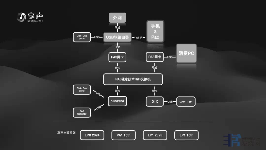 从中可以非常明显看到,D1D2D1X或者D300REF产品,可以直DiskonePA2相连,也可以把Diskone+USB软路+PA3组成HIFI NAS,同时PA3 HIFI交换机也能作为核心交换连接不同的网络设备这里要特别强一点,要让HIFI交换机发挥出完美效果,太脏的消费级网络输出,必须要通过PA3网卡版进行过滤再接入,否则会干扰到HIFI交换机的电源系统。另外,D2D1等产品的自带网卡不如PA3网卡版,建议在HIFI交换机之前,串一个PA3 网卡版效果更优。享声不仅提供完整的HIFI串流解决方案,而且提完整的配套电源,满足不同级别系统的优化需要。这里需要说明的是,这个图中的所有连接和外设并所有烧友都需要,它只是一个集成图,部分烧友可能不玩HIFI NAS,就不需要HIFI NAS部分;部分烧友不玩HQPLAYER等高性能消费主机,就不需要消费PC主机连接到系统的部分。所以,按个人玩法来选择