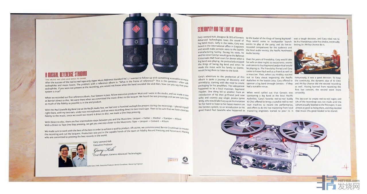 唱片诞生源于一场音乐缘分。Genesis设计总监兼CEO Gary Koh因设计放大器外包装而结识音乐人Raymond Hayden,进而认识“the Kings of Swing”大乐队领队Paul Sawtelle。2022-2023年西雅图太平洋音响展上,Genesis赞助该乐队演出,当消息传出,Gary最喜欢的开盘磁带录音机好友Ki Choi主动提出要带一台合适的磁带录音机去现场录制演出,而当地母带工程师们纷纷主动提出要现场进行母带处理。这是一个艰难的抉择,Gary努力不让友情影响自己的选择,最终还是决定让Dr. Phillip Chance来做这件事。所以在2022年和2023年太平洋音响展都邀请了The Paul Sawtelle Big Band前来表演,受到了音响发烧友观众的一致好评。而且在2023年,Gary带来了他价值500多万一对的旗舰扬声器系统Genesis Prime+,这本身就是一个重大新闻。