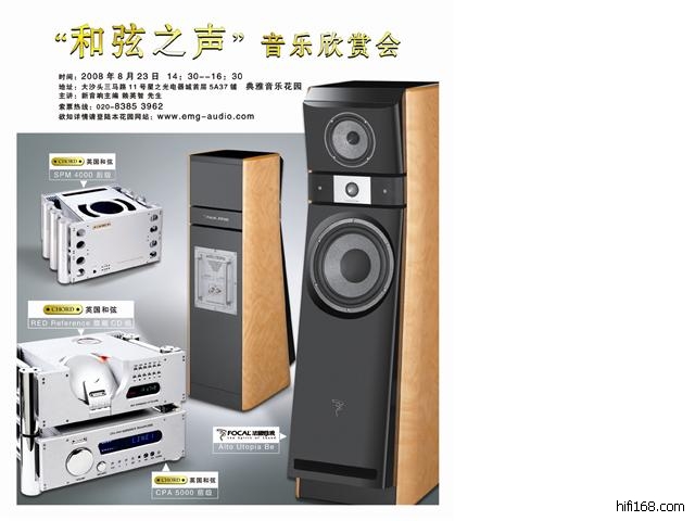 2008年8月23日广州典雅音乐花园举行CHORD、FOCAL音乐欣赏会,介时将会展示CHORD的顶级CD机RED REFERENCE以及极品前级CPA5000,推动法国FOCAL ALTO UTOPIA BE音箱,整体声音优雅,飘逸,极强地表现浪漫自由气息,值得一赏!