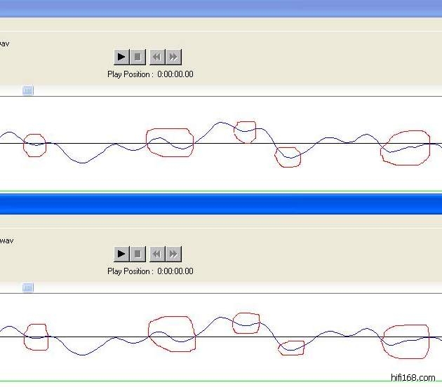 做了一个试验:第一步,同一张音乐CD,先用NERO做一个IMAGE文件,将这个IMAGE文件载入DAEMON虚拟光驱,再用EAC复制为WAV文件(命名为CDIMAGE.WAV);然后用EAC直接将这张音乐CD复制为WAV文件(命名为CDIMAGE2.WAV)。第二步,用EAC打开这两个WAV文件并对比,如图。发现有明显的差异:CDIMAGE2.WAV(下)的波形平滑了一些,也就是频宽窄了一些。因此,是不是可以说用第一种方法抓轨损失可以少一些?