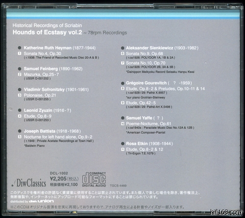 Vol.2在听感上比Vol.1好上不少,这里选出的11首录音由9为钢琴家完成,除了Samuel Feinberg(1890-1962)和Vladimir Sofronitzky(1901-1961)两个俄罗斯钢琴家比较熟悉外,其他7位绝对是稀客,不要说录音,就连生平都难以窥视。