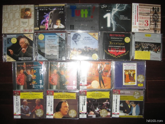 六月下旬新买的一些SACD和新出的一些SHM-CD。其中JVC公司制作的SHM-CD现在初听下来比它自己的XRCD24格式的唱片声音还要自然一些,目前出了大概70多张,里面不乏现在已经绝版的经典版本,与其花大钱购买老版,还不如买现在的SHM-CD版本。