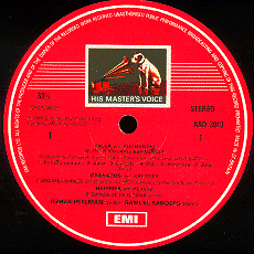 EMI HMV STEREO 2nd Label: Semi-circle , Black/Red Dog,在中間圓洞上方有一半圓形的狗,狗的上方有白色粗體字的HIS MASTER'S VOICE,俗称半月狗