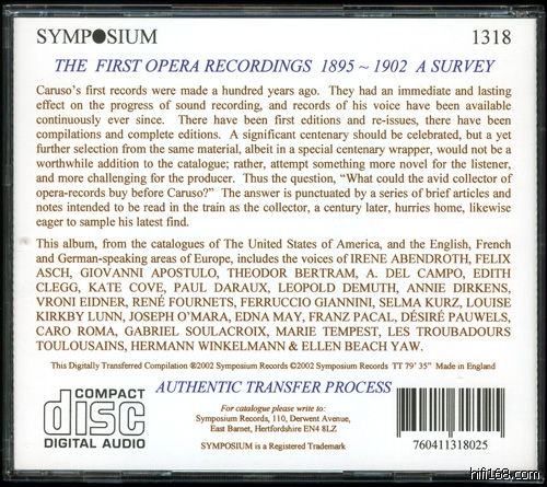 这张是极度珍贵的文献级录音,这是1895年到1902年间(小小的疑问就是里面找不到明确表明1895年的录音-_-)的一些已经很难寻觅的录音,收录的歌唱家都是一般程度上不熟悉的,有的甚至已经查不到生平资料,例如VRONI EIDNER和A. del  CAMPO。而FERRUCCIO GIANNINI(1868-1948)则通常被认为是第一个留下录音的歌剧歌手。