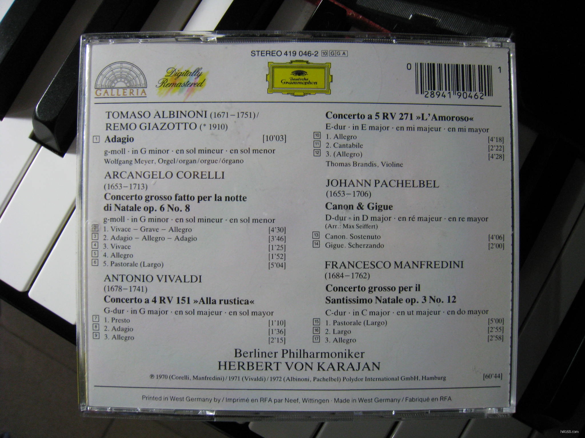 Karajan70年代时在DG很罕有的录了一张巴洛克的音乐集,里面都是耳熟能详或者旋律优美的作品:Albinoni的《g小调柔板》、Corelli的大协奏曲、Vivaldi的两首协奏曲,Pachelbel的《卡农与吉格舞曲》和Manfredini的大协奏曲。乐团是Karajan的亲兵柏林爱乐。