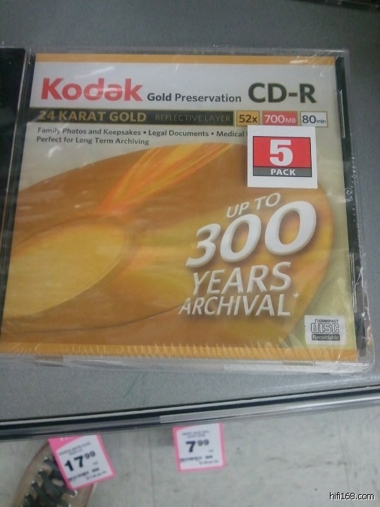 今天逛大卖场,看到柯达5碟装24K金300年CDR碟,被价格吓了一跳,...