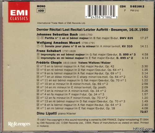 李帕蒂的天鹅之歌50年9月16号贝桑松音乐会大家都再熟悉不过了,EMI的参考系列也是不二之选;我以前也提过参考系列有两个版本,一个是编号CDH 5651662 的国际版,还有一个是编号8700012的法版赠碟,两者应该是一样的;结果没想到这两套录音居然是不同时间的后期制作! 而且录音差别还不小!!!
