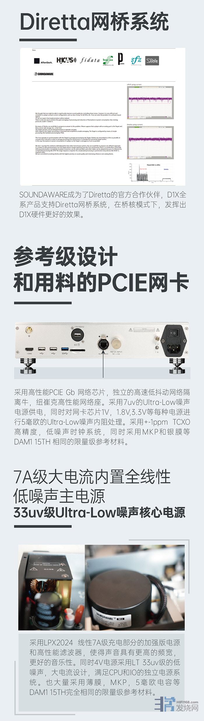 D1X不仅采用参考级的X86主板,而且它的PCIE扩展网卡和USB同样极致。PCIE芯片从1V、1.8V、3.3V、5V等均采用100KHZ 5毫欧电源内阻优化。晶振也采用+-1ppm TCXO时钟系统,光定制版就有高达5个相同水平的+-1ppm时钟系统和几十个类似100KHZ 5毫欧电源系统。另外,定制版还内置了一个参考级时钟和电源的PA2 SATA再生固态硬盘模块,让用户的本地固态硬盘也能拥有如参考级存储一样的好声音。