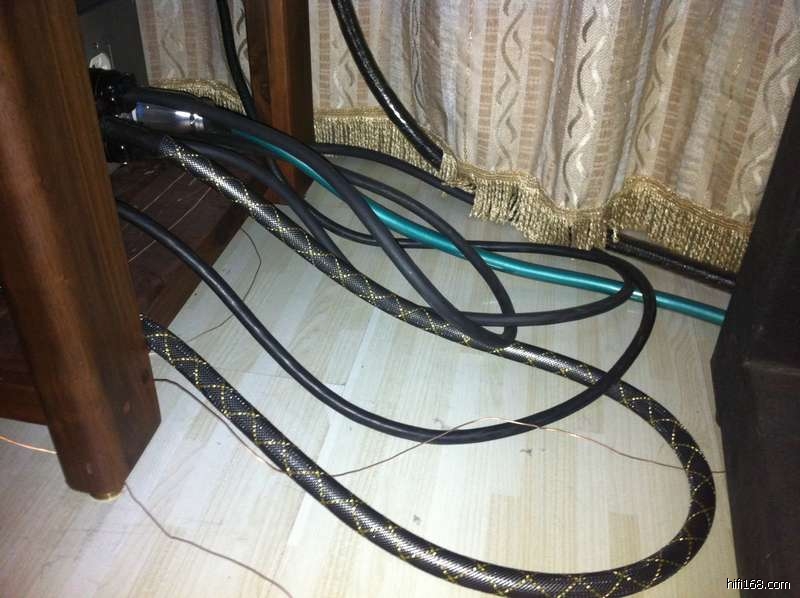 另外,有的发烧友有个好习惯,会把自己的线材整理的非常清爽有序,而有的发烧友就非常的粗枝大叶,线材乱成一堆,殊不知那种乱成一堆的线材本身就会造成信号干扰,影响音场的稳定性、结像力和细腻度,所以,还是先花点时间把你那对乱七八糟的线材好好整理清楚在决定是否要花钱去换线材吧。按照我的经验,线材的流动性非常讲究,一般而言,从前段器材的后级至转盘的顺序进行从下到上的排序,电源线永远都要放置在信号线和喇叭线的下面,依次的顺序为(从下到上):排插电源线、后级电源线、前级电源线、解码电源线、转盘电源线、喇叭线、前后级信号线、解码到前级信号线、数码线等等。如果能够将电源线和信号线分开来放,效果最为理想,请看下图。