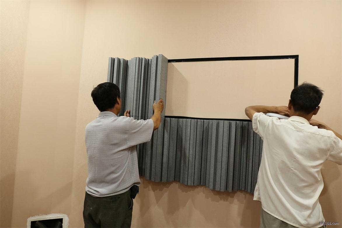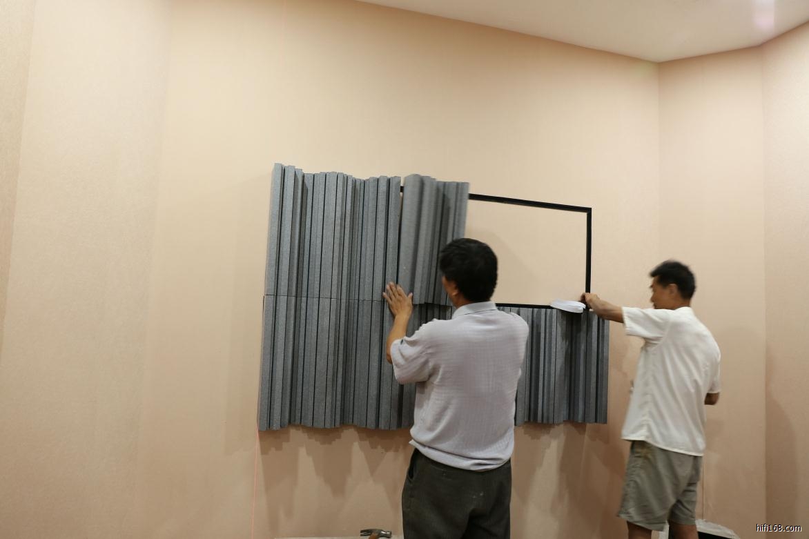 由于新的试音室三面是砖墙,后面是玻璃,在未做处理的时候,即使平常讲话亦有有很大的回声,播放音乐低频经常是轰鸣,