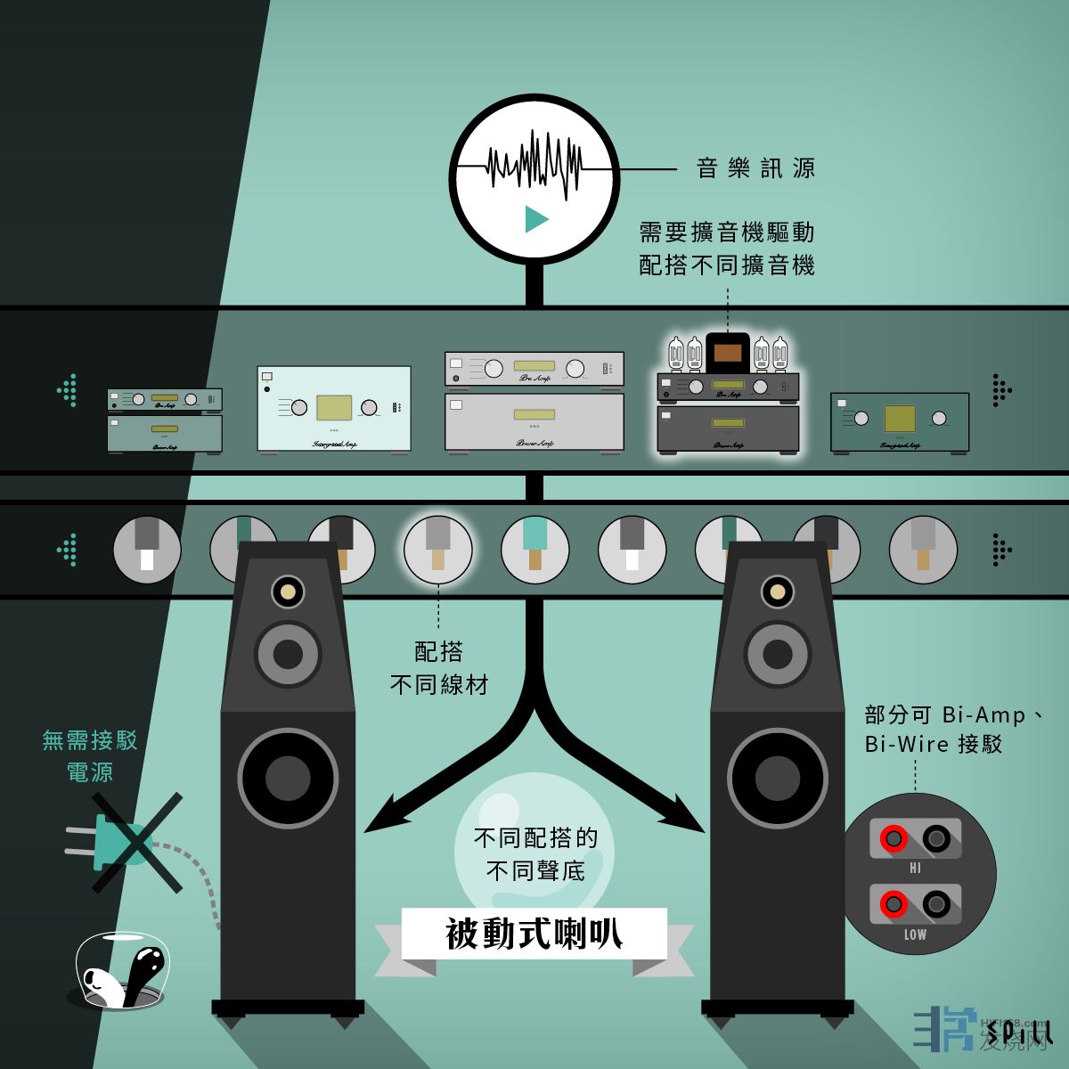 部分被动式音箱可以支持 Bi-Amp 以及 Bi-Wire 的接驳方式,通过线材接驳、额外后级等来提升音箱的表现。