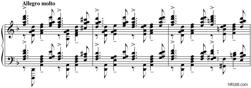 最后,我想举出拉赫玛尼诺夫的一个值得商榷的录音:莫扎特的钢琴奏鸣曲K.331里面的《土耳其进行曲》。到乐章完结部之前几乎没什么问题。这是首2/4拍的曲子,每拍由4个四分音符组成。但是在拉赫玛尼诺夫演奏的完结部里,他在一些拍子里只演奏前三个四分音符,故意漏掉最后一个四分音符。其结果就是,这样演奏的那些小节都成了一又二分之一拍。实在让人迷惑。
