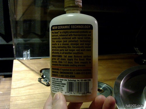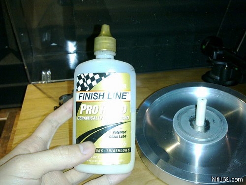 平时用的顶级自行车链条油,其实最适合黑胶唱机的使用环境,我平时用的是一种美国产叫“终点线金盖”英文叫“Finish Line”的陶瓷润滑油,润滑性能和持久性是最好的,很适合黑胶唱机这种低转速高润滑要求的机械部件,因为这款油会在油膜产生一层高分子陶瓷层,润滑性能立杆见影(当然是自行车上)。