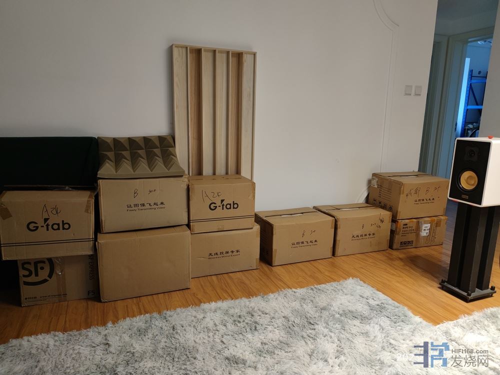 房间处理的难题是中低频的处理,中高频相对容易多了,布艺沙发、窗帘、地毯等都能吸中高频,实在不行,上聚酯纤维板,它对中高频吸音效果非常出色,但低频不行,0.8cm厚的才有一点点。吸音板更好一些,不过它也比较贵。而吸收低频的处理手段,除了低频陷阱,我就没有查到有其它的了。不过低频陷阱死贵,经济实用的办法才是俺们的最爱。后面会讲到些,比如纸箱塞满东西这种。不过,吸到理想值就别想了,我感觉能接近就不错了。