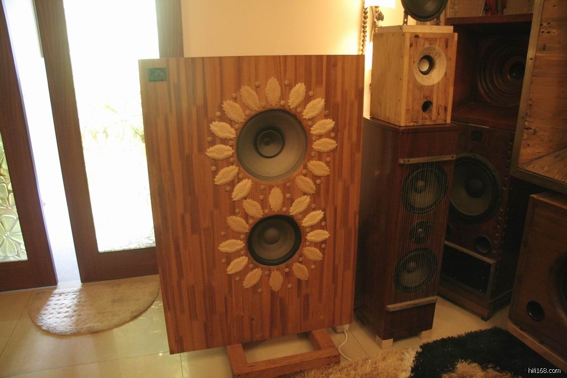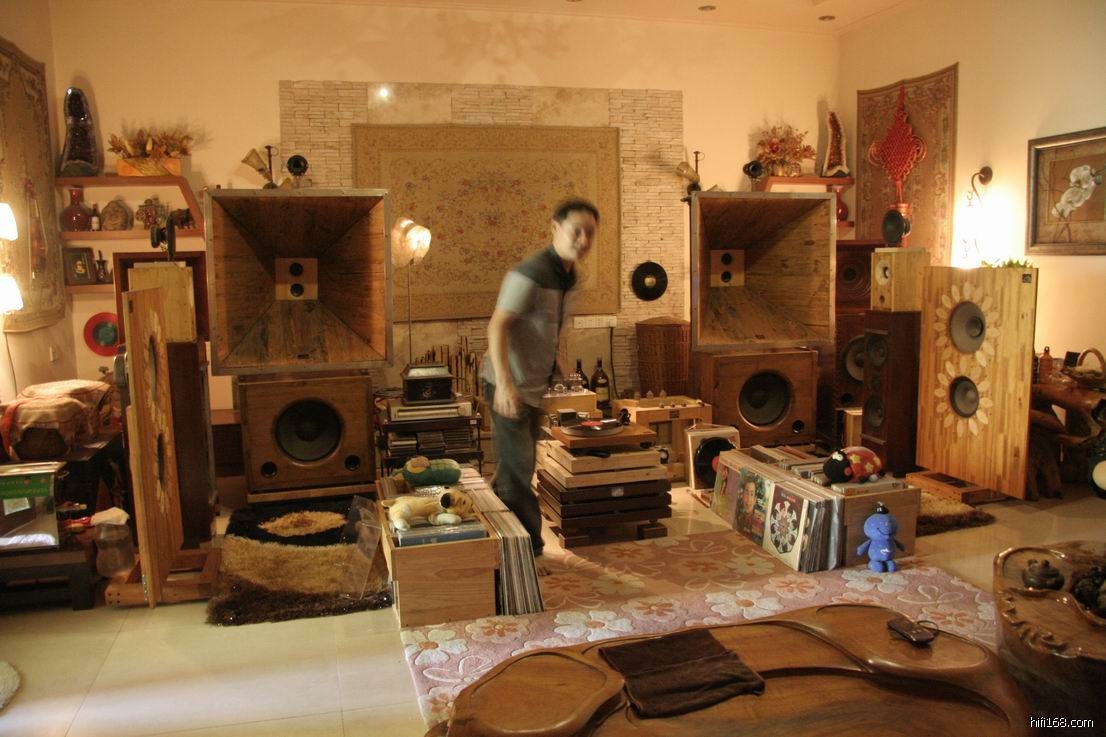 首先到达的是发烧友叶先生的家,叶先生是一位机械工程师,因为爱上音乐,所以和音响有着深厚感情。叶先生的音响系统是由飞利普 850MKII CD音源,大功率813胆单端合并机,一对双十二寸低音落地大箱所组成,所有线材都是叶先生精挑细选自制的。听了几首乐曲后,才细心地欣赏那对手工一流的大型落地箱,刚开始以为是某进口品牌产品,但是叶先生告诉我们,这对是他花了很大的精力打造出来的,使用一些不是贵价喇叭,但经过多次的不断调试,现在的效果众人都说效果很满意,听交响乐有动态,有速度没有一点拖泥带水。听蔡琴老歌,常安的达玛花等人声也有不错的表现,当天如果高频段收敛一点,中频加厚一些会是一套物超所值的系统。DIY精神是要不停的去探索,不断的去尝试和改进才能做出美妙的乐曲,这是DIY的乐趣!
