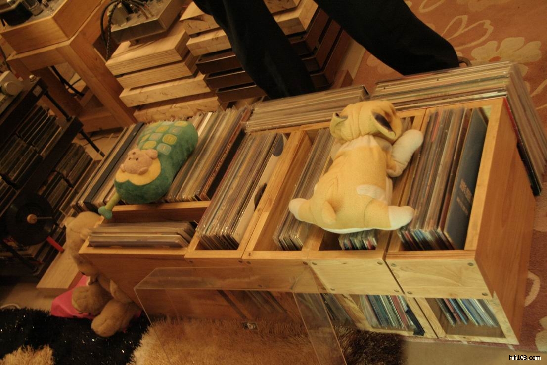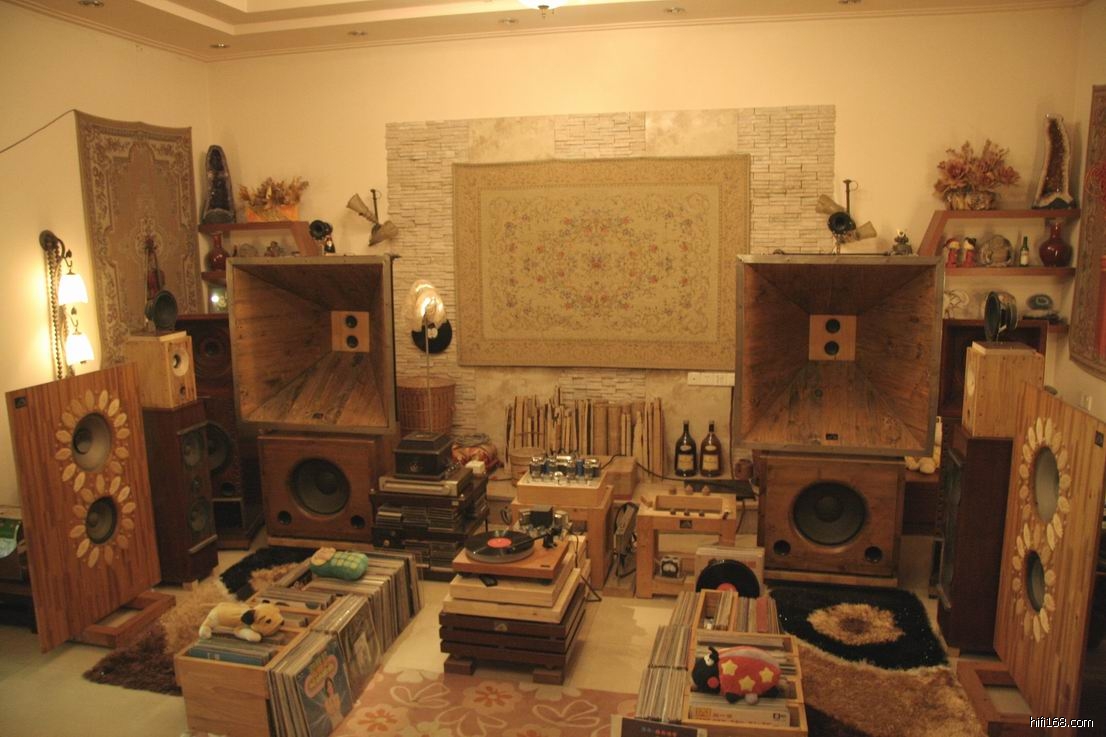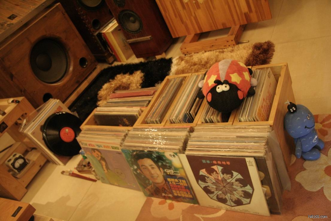 外卖的听音室有两间,二楼是一间宽6米,长7米怀旧房。为何是怀旧房呢?因为这间听音室报听的全是黑胶唱片,唱片大多数是60年代的歌曲,音室里摆放着很多外卖喜欢的木制品,加上昏黄的灯光令人有种心情舒畅,品尝着陈年的生普茶听着黑胶音乐真是一大享受。在这时候什么定位,什么动态,什么音效都谈不上,因为我们不需要,我们整个人已溶入音乐之中,在这里的声音是没有压迫感,可以不经意地听几个小时音乐也不累。