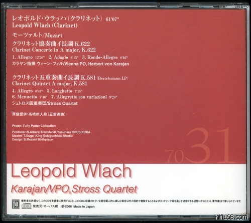 作为新星堂盘的补充,介绍一下OPK这张盘。Leopold Wlach(1902-1956)是维也纳学派的代表人物,教出不少杰出的学生,他1928年加入维也纳国立歌剧院,同时起成为维也纳爱乐的成员直到去世,他也是维也纳八重奏组的成员之一。Wlach不光自己是维也纳爱乐的首席,他的学生Prinz后来也是,另外一个学生Leister则是柏林爱乐的首席。二战之后Wlach在Westminster留下了非常多的录音,然而这里的两个非Westminster录音却是让人遗忘的。
