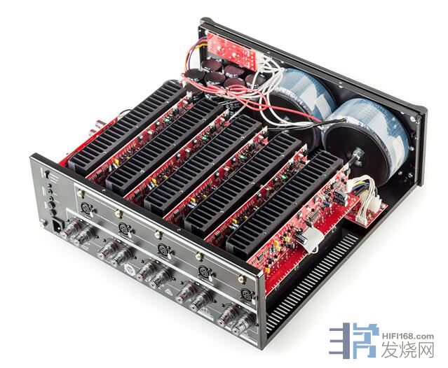 圣歌Anthem后级的特色就是采用模组化设计,这款MCA 525当然也不例外,每声道各有一个功率模组,所以共有5组,而每个功率模组使用8颗bipolar功率晶体,8欧姆负载时可以提供扎实的225瓦输出功率,阻抗下降至2欧姆时,输出功率更可攀升至600瓦。而且MCA 525不仅是肌肉猛男而已,而有低失真的特点,总谐波失真仅0.001%而已