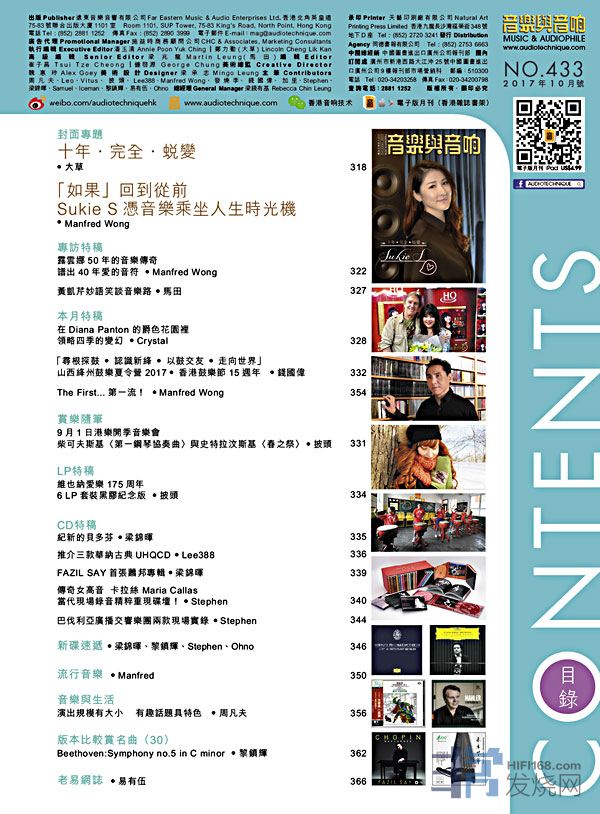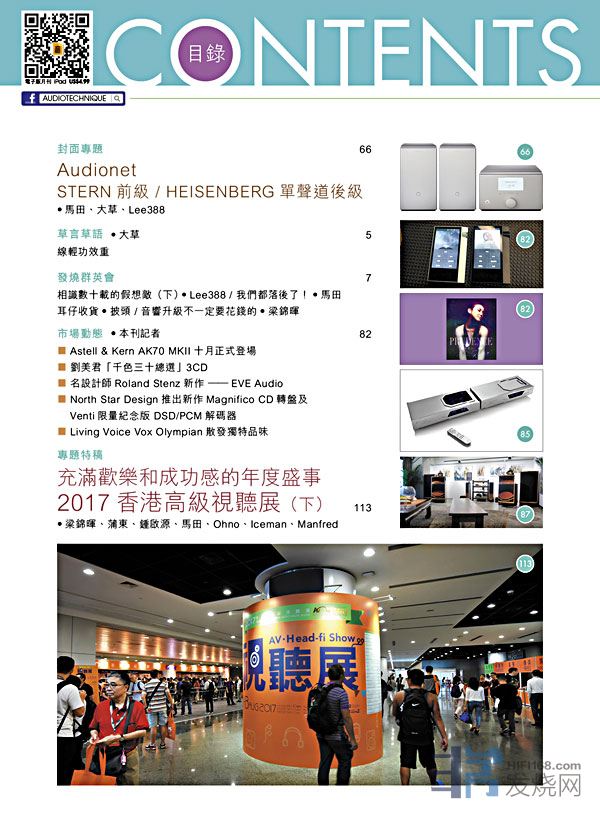 今期封面專題由馬田、大草、Lee388評論Audionet STERN前級 / HEISENBERG單聲道後級,梁錦暉、蒲東、鍾啟源、馬田、Ohno、Iceman、Manfred聯合繼續報導充滿歡樂的年度盛事 2017香港高級視聽展,其他評論文章包括:Crystal Cable Ultimate Dream喇叭線、 Siltech Triple Crown電源線 、Audia Flight FLS1前置放大器與FLS4兩聲道功率放大器 、Ortofon MC Windfeld Ti 唱頭 、 Outlaw RR2180放大器、Entreq Primer訊號線及喇叭線 、Nordost QKORE 6地盒、Astell&Kern A&ultima SP1000、Cambridge CXUHD 4K藍光機 .....,詳細內容請參閱目錄。 今期音樂與音響封面專題的受訪歌星是Sukie S,由大草哥和Manfred分別執筆寫出Sukie的心聲,另外,Manfred亦訪問了露雲娜,細談過去音樂歷程裡的點滴,黃凱芹妙語笑談音樂路,除了歌星訪問之外,錢國偉為讀者分享他在【山西絳州鼓樂夏令營2017】的所見所聞…詳細內容不能盡錄,豐富碟評與音樂會介紹您豈可錯過!