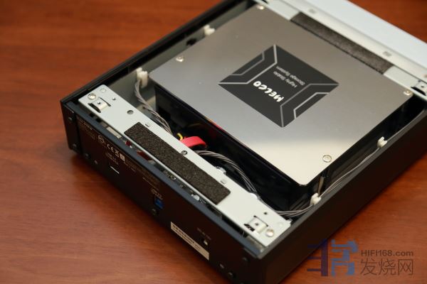 这是E100,内含一颗3.5吋HDD,这颗硬盘也是以极厚的铁板紧锁在机壳内,铁板与硬盘之间铺有阻尼物,借以吸收震动。