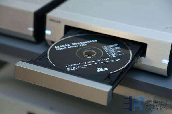 接着放上一张美国摇滚女歌手Alanis Morissette的「Jagged Little Pill」专辑CD,然后按下承盘下方的圆键,让承盘阖上。