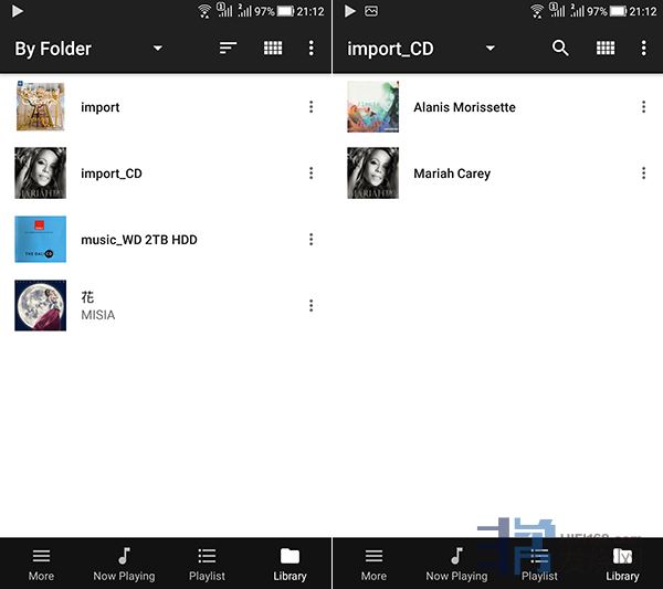 图左:接着我用手机的BubbleUPnP app查看是否有rip进N1ZS/2A。所有rip的音乐都会存进「import_CD」资料夹,点选它。图右:可以看到N1ZS20已经自动建立了一个「Alanis Morissette」资料夹,刚刚rip的CD就存在该资料夹里。