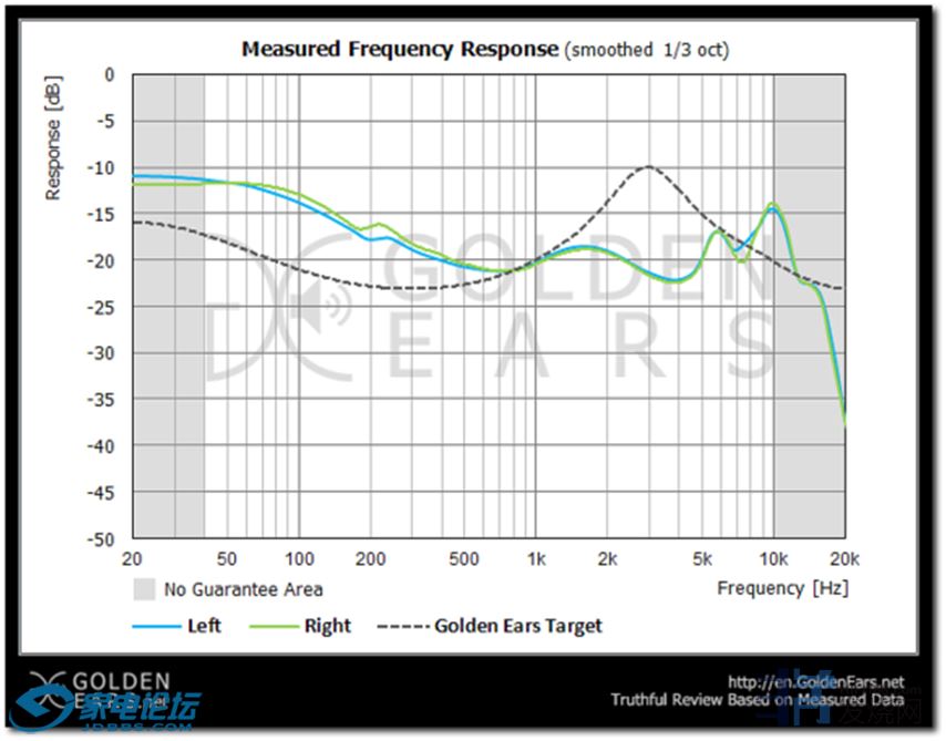 知名耳机(也就是ie800)的曲线,虚线就是golden ears网站的目标曲线: