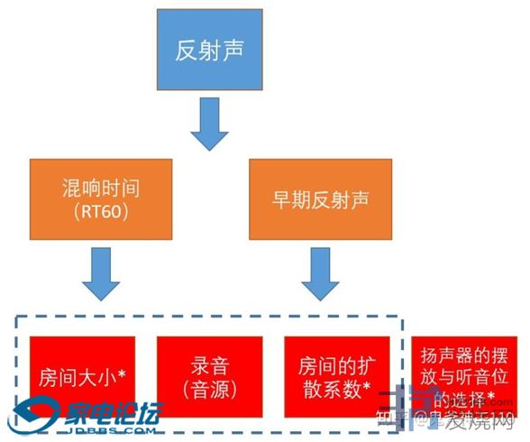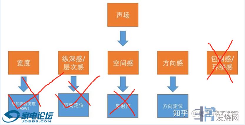 很明显,耳机这种没有声场的感觉与我们的现实生活中的声音相去甚远,但是音箱通过电声回放,也是无法精确地还原某声场的,如果这样我们应该去还原些什么东西呢?关于复杂的声场中的几个关键因素如下(感谢鬼斧神工把Floyd E. Toole著作作的图示整理):