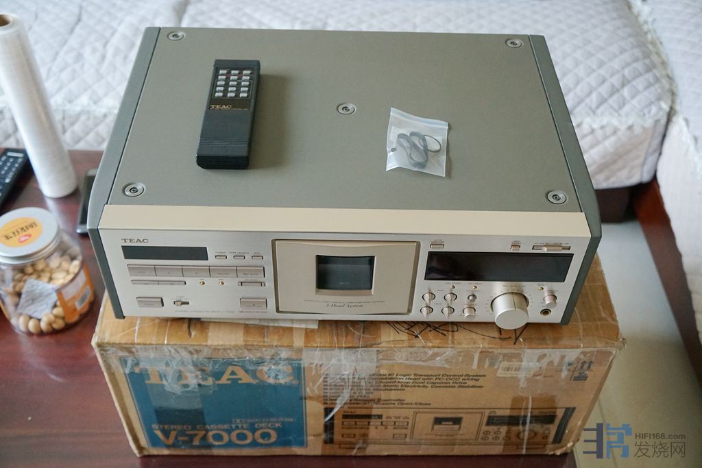 出日本TEAC卡座 经典TEAC-V7000三磁头立体声卡座,香宾色面板,220V电压,浓郁的模拟味,音色好,层次分明,收自卡坛版主老猪,成色极新(实物图),机器原汁原味(老猪版主保证机器为出厂状态,无标调过,),磁头基本无磨损,本人买来时内部清洗过一次(刚买来时播放速度有点慢,打开发现里面飞轮皮带很久没用有点脏,就拿专用清洗剂清洗),机器绝对无修无摩,无磕无碰,无暗病,现在录放效果一流,状态一流,除了四类带偏磁调整有时无法到位(一二类带轻松到位),其他功能全部正常,原包装.遥控.再送一套备用皮带,(已出)