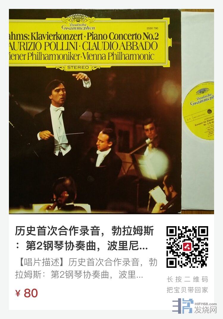 【唱片描述】历史首次合作录音,勃拉姆斯:第2钢琴协奏曲,波里尼钢琴/阿巴多指挥维也纳爱乐乐团,DGG德国小花首版,NM