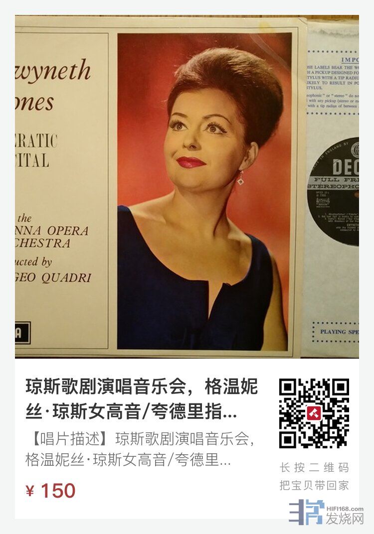【唱片描述】琼斯歌剧演唱音乐会,格温妮丝·琼斯女高音/夸德里指挥维也纳歌剧团,1966年,DECCA英国宽标有沟首版,NM