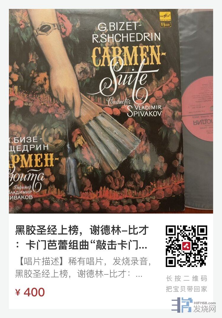 【唱片描述】稀有唱片,发烧录音,黑胶圣经上榜,谢德林-比才:卡门芭蕾组曲“敲击卡门组曲”,斯皮瓦科夫指挥莫斯科艺术家室内乐团、亚美尼亚室内合奏团及打击乐团,苏联旋律红标原版,1988年压片,NM-至NM(苏联旋律唱片均有均匀轻微底噪,属正常现象)